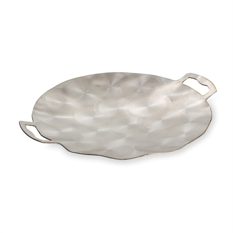 Садж из нержавеющей стали с цельными ручками. Прослужит долго благодаря своим высоким антикоррозийным свойствам. Внутренняя поверхность саджа украшена узором в технике "снежок".